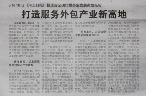 邢臺(tái)眾聯(lián)科技服務(wù)有限公司作為邢臺(tái)市服務(wù)外包產(chǎn)業(yè)的龍頭企業(yè),于3月10日分別在《河北日?qǐng)?bào)》第07版中國(guó)?國(guó)際版面及邢臺(tái)《開發(fā)區(qū)報(bào)》頭版以“打造服務(wù)外包產(chǎn)業(yè)新高地”為題,刊登了眾聯(lián)科技發(fā)展服務(wù)外包產(chǎn)業(yè)新聞。文中提到眾聯(lián)科技將充分發(fā)揮服務(wù)外包產(chǎn)業(yè)的帶頭作用,積極帶動(dòng)邢臺(tái)經(jīng)濟(jì)開發(fā)區(qū)服務(wù)外包產(chǎn)業(yè)的蓬勃發(fā)展。