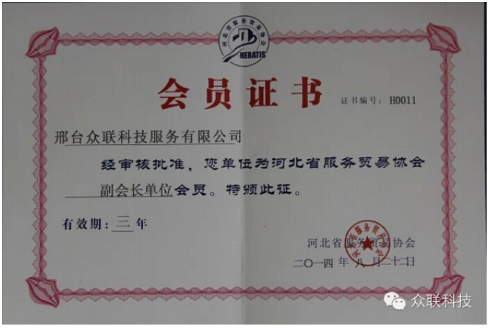 河北省服務(wù)貿(mào)易協(xié)會在對邢臺眾聯(lián)科技服務(wù)有限公司進(jìn)行規(guī)模、信譽(yù)度等各方面情況進(jìn)行嚴(yán)格審查后,認(rèn)定邢臺眾聯(lián)科技服務(wù)有限公司符合協(xié)會會員資格,并頒發(fā)了河北省服務(wù)貿(mào)易協(xié)會副會長單位會員證書,這標(biāo)志著眾聯(lián)科技在服務(wù)外包行業(yè)邁向了一個新的臺階。